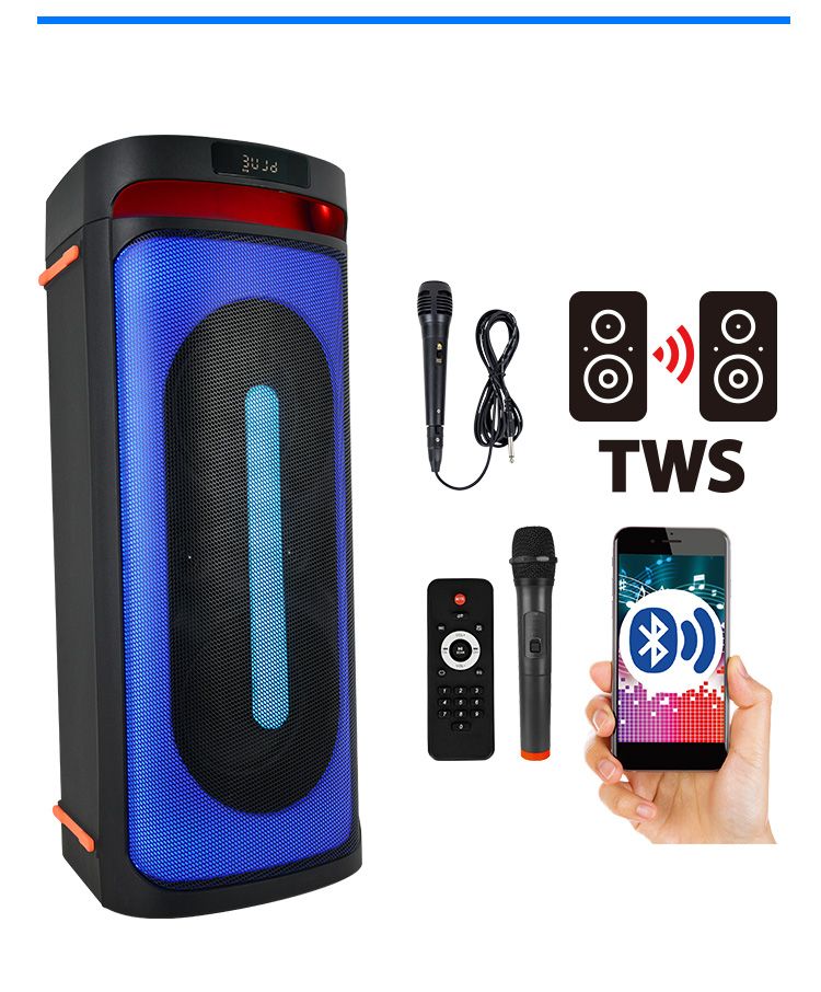 TWS/Bluetooth/USB/TF/REC/FM/Remote control/Record/12V 5.5Ah lead-acid battery/AUX Input/EQ/Mic input jack/Guitar/Mic priority function/LED light ON/OFF switch/English Voice broadcast/7changeable light on front/20V4A/RMS:60W