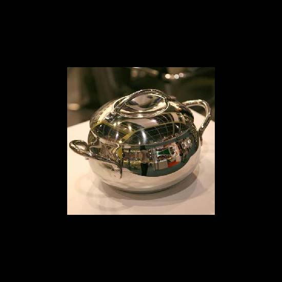 This small cooking pot is made from clean, polished aluminium for durable practicality