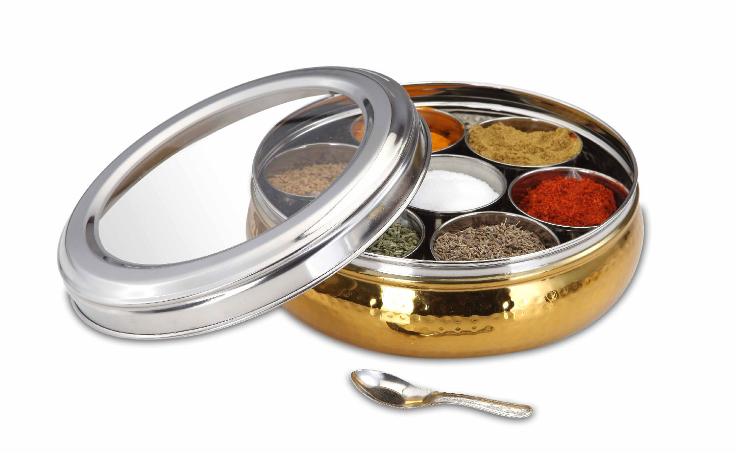 Stainless steel spice box with c'thru lid outside hammer and golden colour coating.