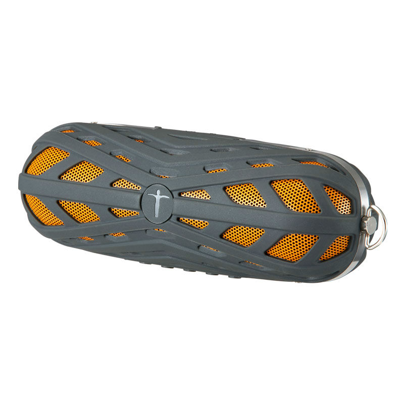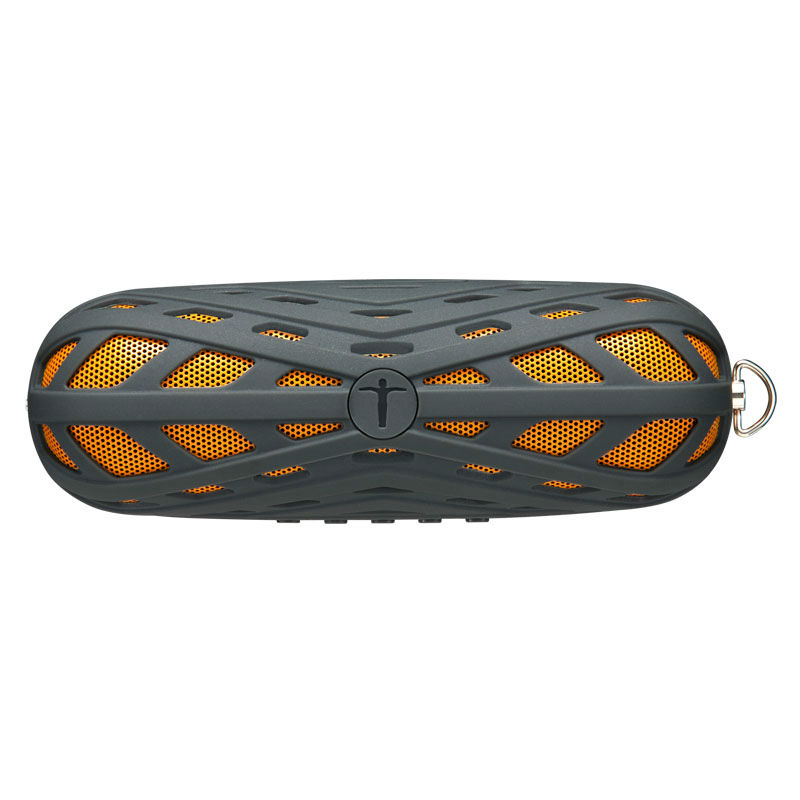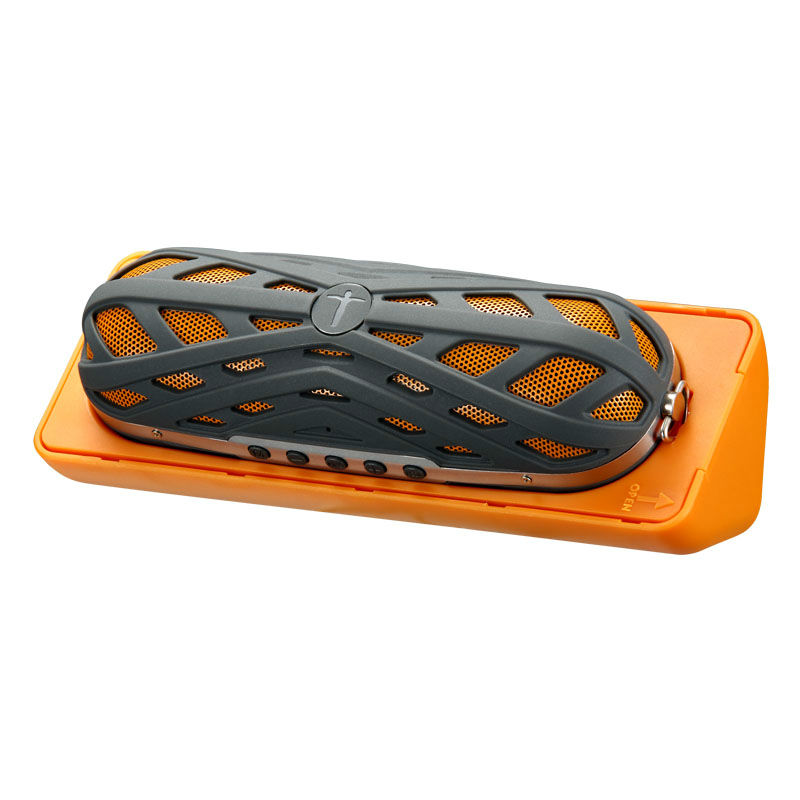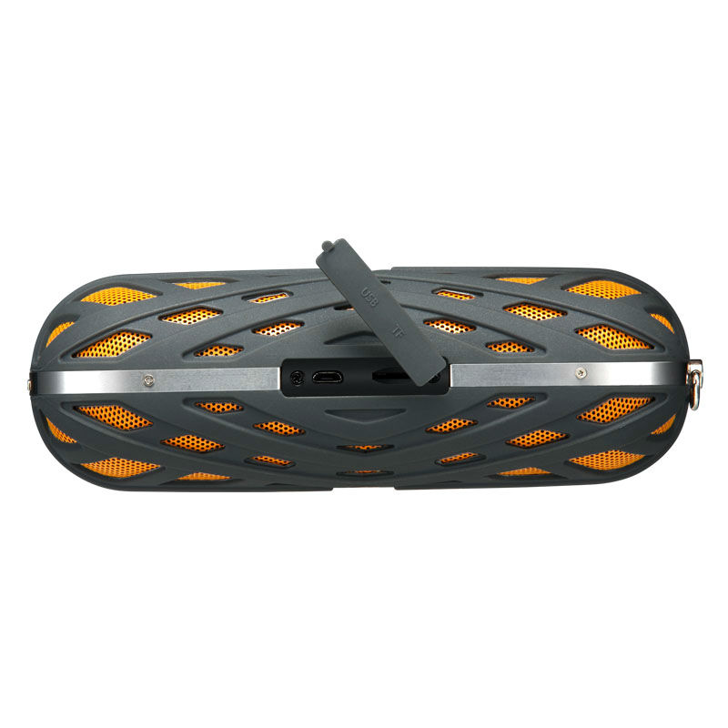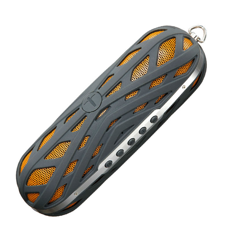 Displayed here is a Bluetooth speaker with three-proof function for outdoor use. It is adorned with spider web patterns and has buttons on the side for control. This speaker comes in a pocket size and is great for carrying anywhere.