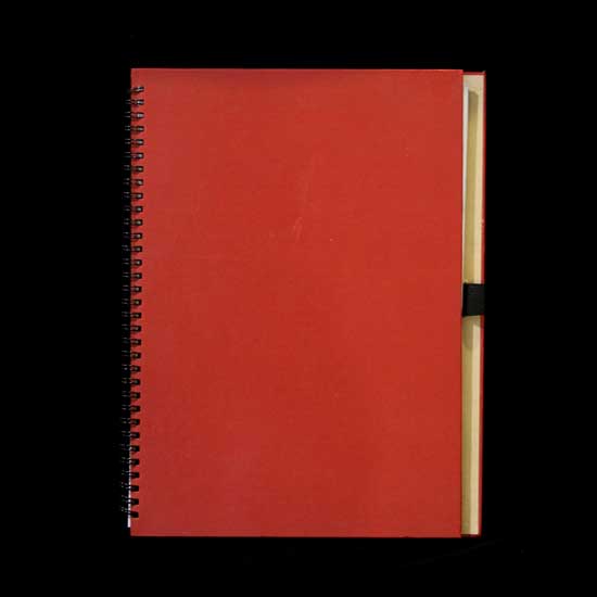 The spiral bound notebook comes in a rectangular shape. This piece features a solid-red cover. It also contains plenty pieces of paper inside.