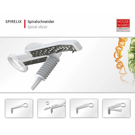 As quick as a flash, the SPIRELIX spiral slicer transforms radishes, cucumbers or any other vegetables into decorative julienne, curls and spirals. In contrast to conventional spiral cutters, SPIRELIX is smaller and more manageable. With its etched blade and the patent-pending attachment for julienne cuts, Spirelix slices through even the hardest of vegetables.