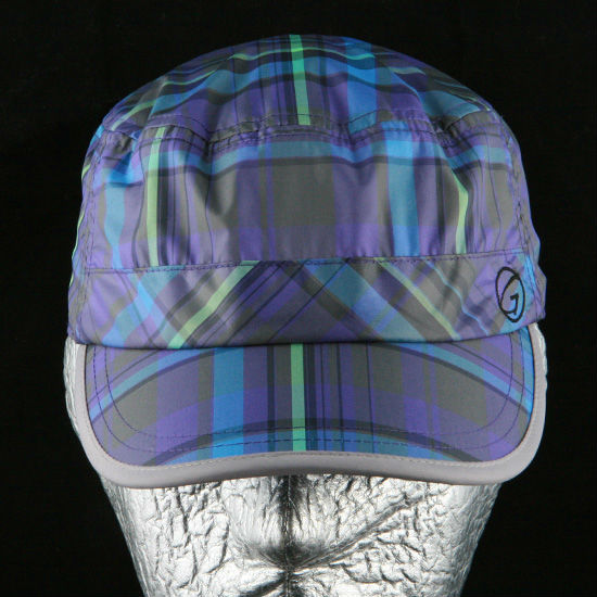 • Plaid pattern in gray, purple, green and blue colors.