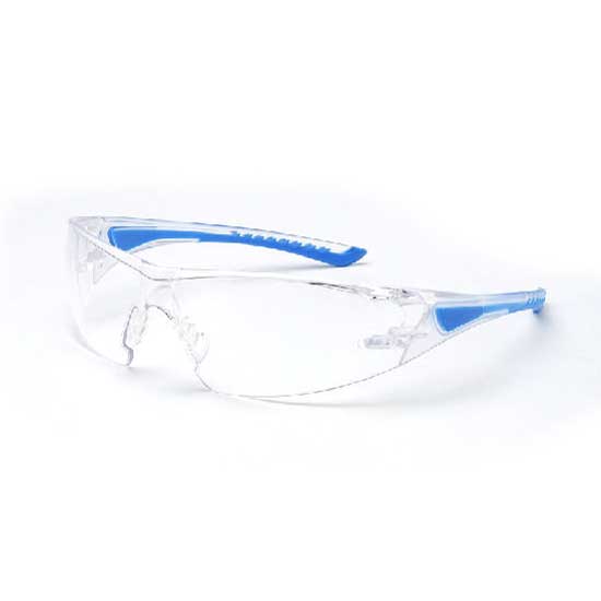 This is a pair of sports eyeglasses that is made with a plastic hinge design without any metal part. The ergonomic design offers a soft and comfortable fit to wearers. The two-toned design in transparent and blue create a striking effect.