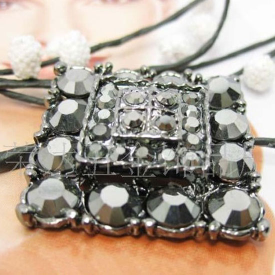 This is a fashionable brooch in a square shape. It is decorated black stones in assorted sizes. Each stone has delicate facets for maximum luster.