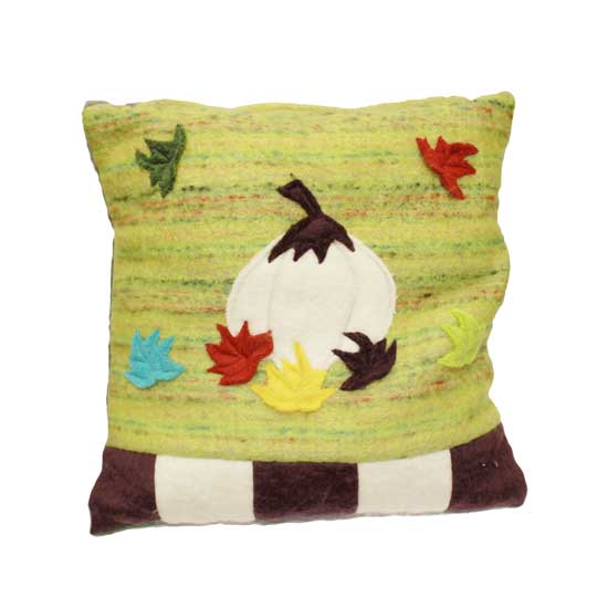This square-shaped cushion is designed with colorful pumpkin and leaf appliqués on the front. The cushion is made from mohair fabric for a soft and comfortable touch. It is a great decoration for your sofa and bed.