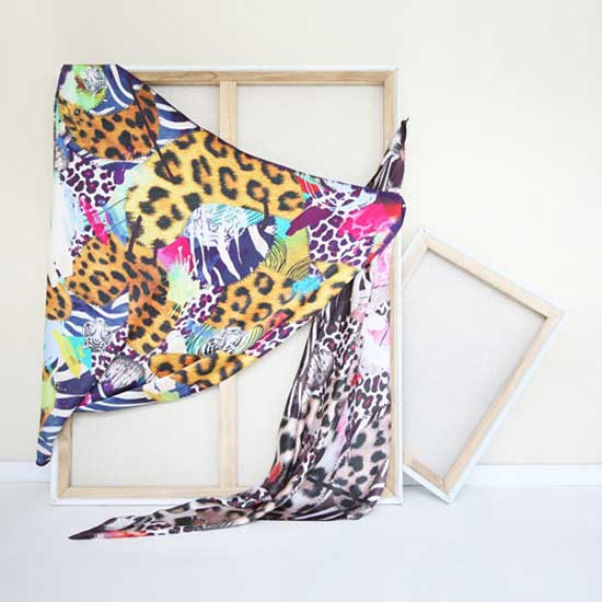 Highlighted is a gorgeous scarf made of premium silk. The scarf features a combination of various animal prints in sharp colors. With a smooth and soft touch, this scarf makes a perfect choice for mix and match.