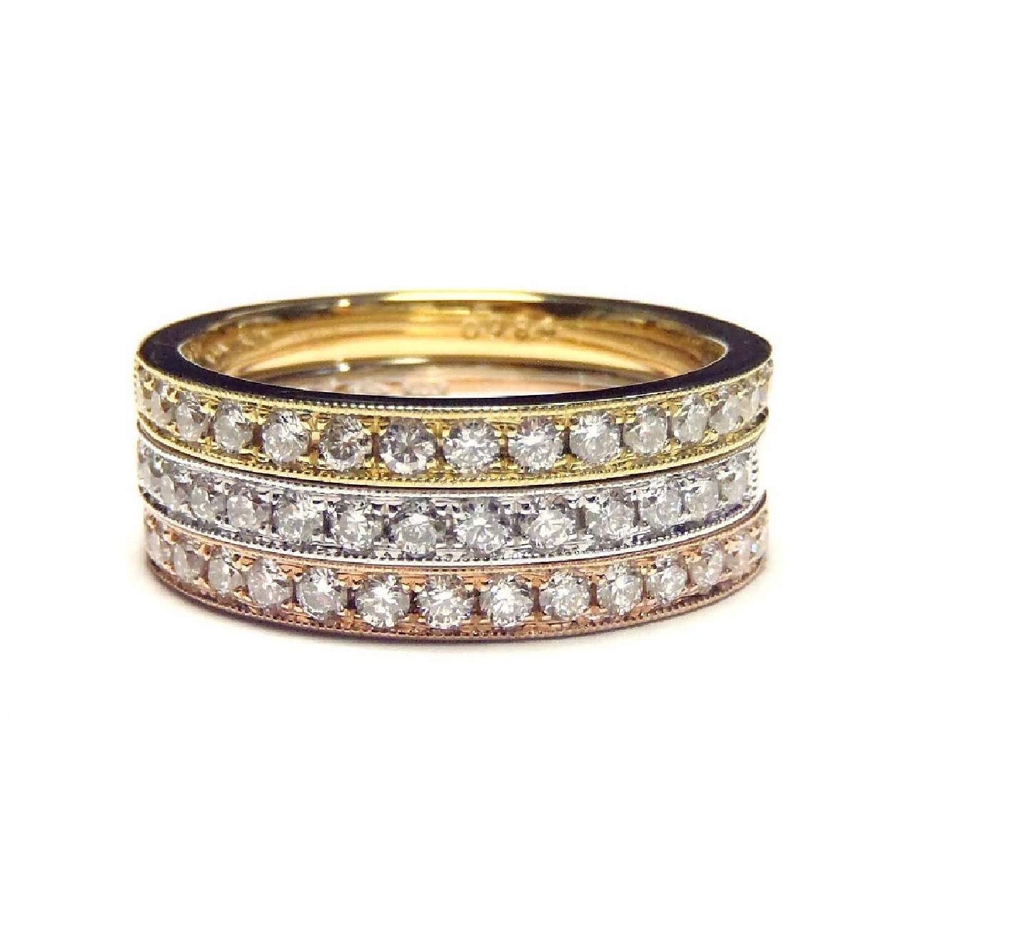 This stacker ring set consists of three stacker rings in various colors. The rings are embellished with a clear stone pave. It is an ideal accessory for weddings and special occasions.