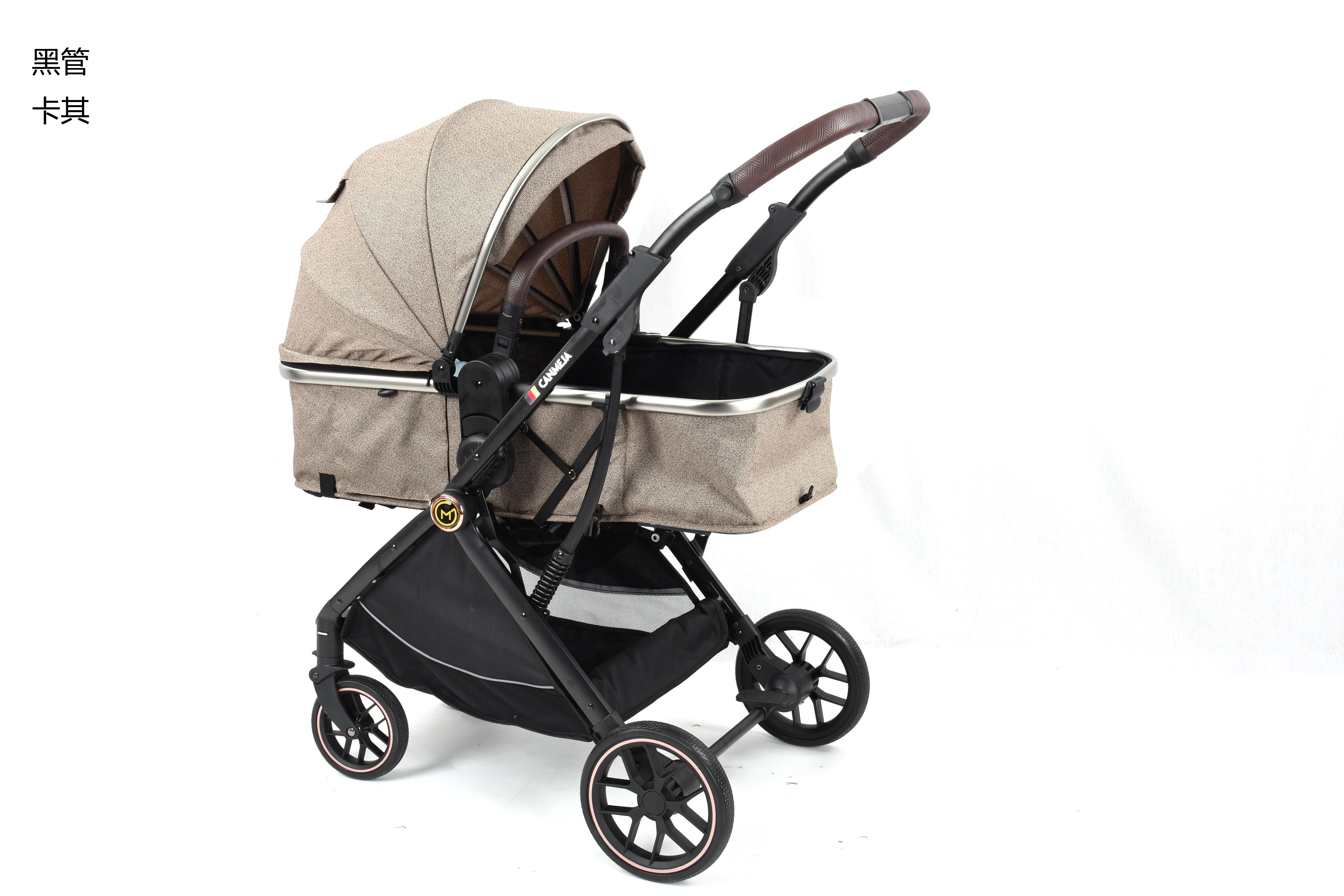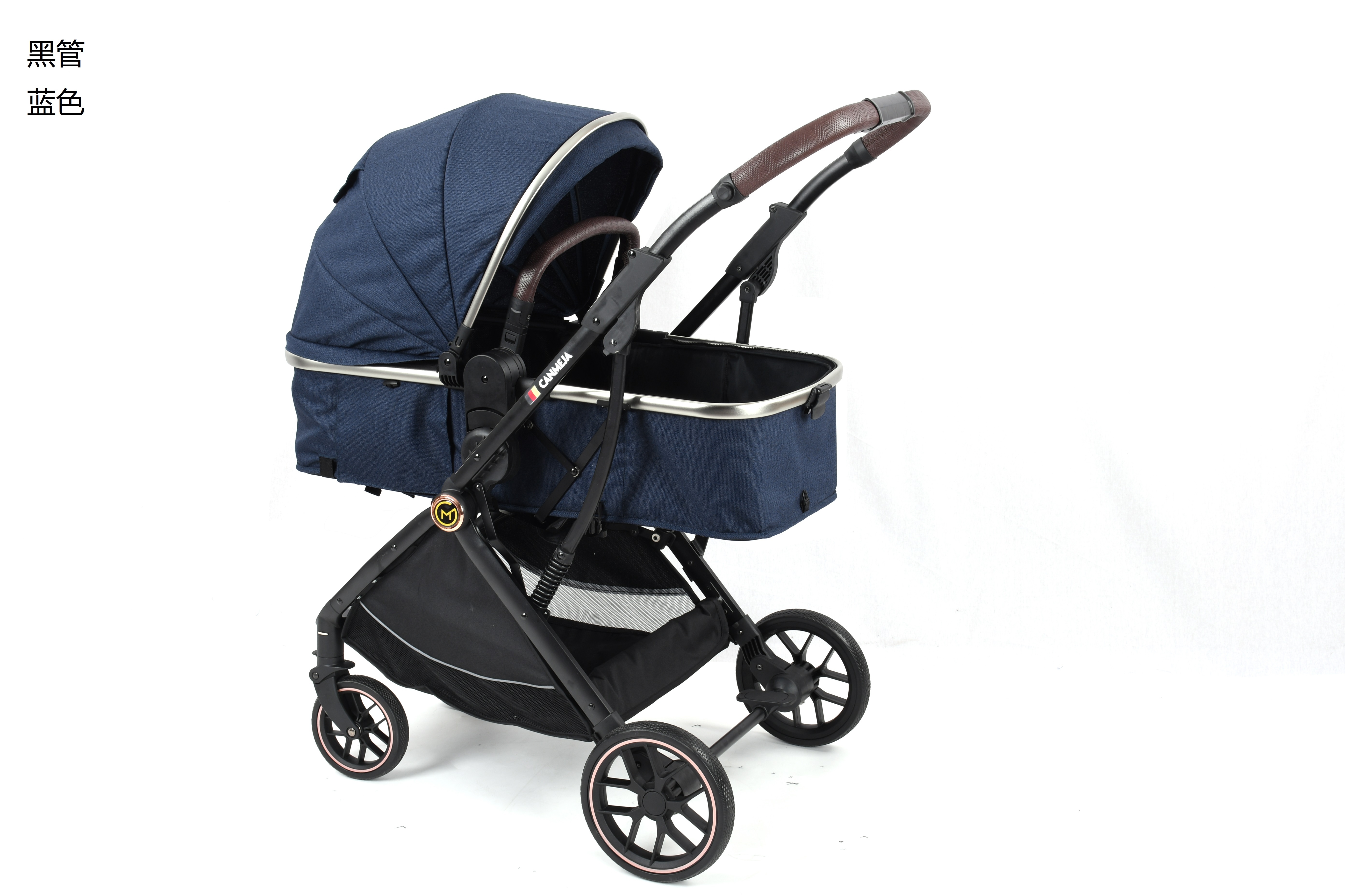 This baby stroller comes in a four-wheeled design and has a robust stainless steel frame. It provides a comfortable place for babies to rest in and has a foldable canopy for shading. The baby stroller has a large handle bar for easy pushing and has a tray at the bottom for storage.