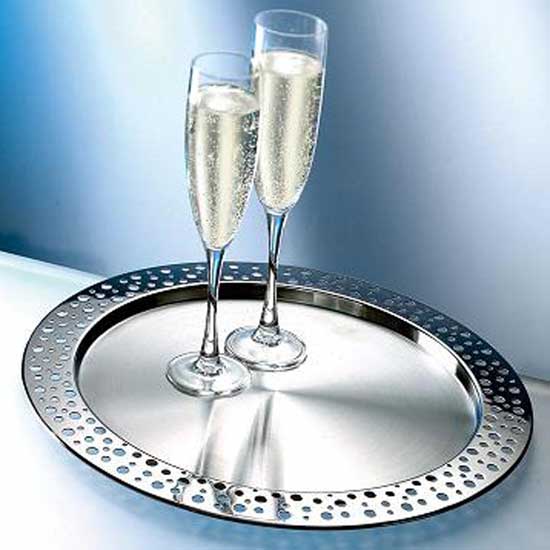 Serve your guests with the featured bar tray. It is suitable for holding drinking glasses and plates. The silvery tray is stylish in design with some dotted patterns on the rim.