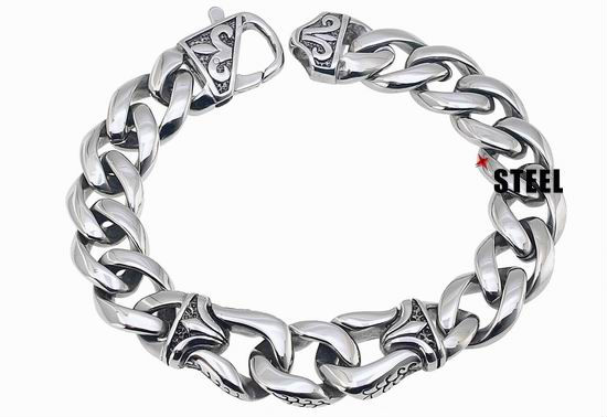 The bold curb chains of this stainless steel bracelet adds effortless style to your casual outfits, centering three interlocking links with swirling patterns for modern definition. Its adorned lobster clasp finish further guarantees neat fastening on wrists.