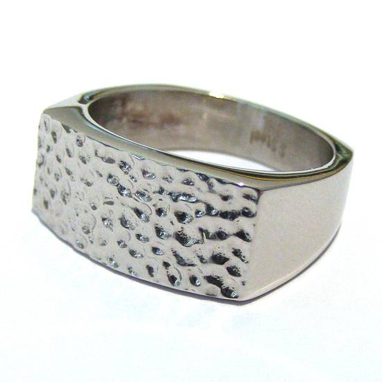 This is a casting ring made of stainless steel. The casting ring has a hammered top. The irregular hammering pattern brings a sense of power and force.