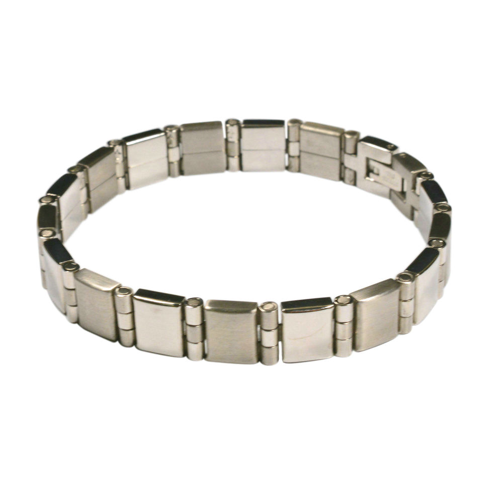Presented here is a plain yet rugged stainless steel bracelet for pairing with many types of attires. It comes in a watch bracelet style with polished hinges and components. Constructed with a jewelry clasp, this bracelet closes securely by snapping the latch.
