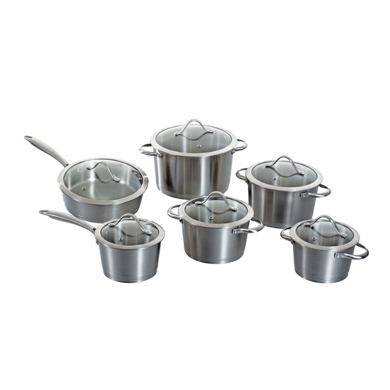 Demostrated here are the stainless steel cooking pot set with sheeny lustrous silvery appearance. All slender handles are stoutly riveted on the transparent cover, flaunting its aesthetic design. A small hole is created on the glassy lids, allowing hot steam ventilation without lifting up.