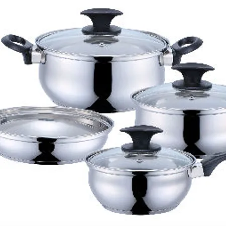 Stainless steel cookware set with saucepan, casserole and frypan, heat-resistant bakelite handles, transparent glass lid for easy view while cooking, thick aluminum core in the bottom for good heat distribution