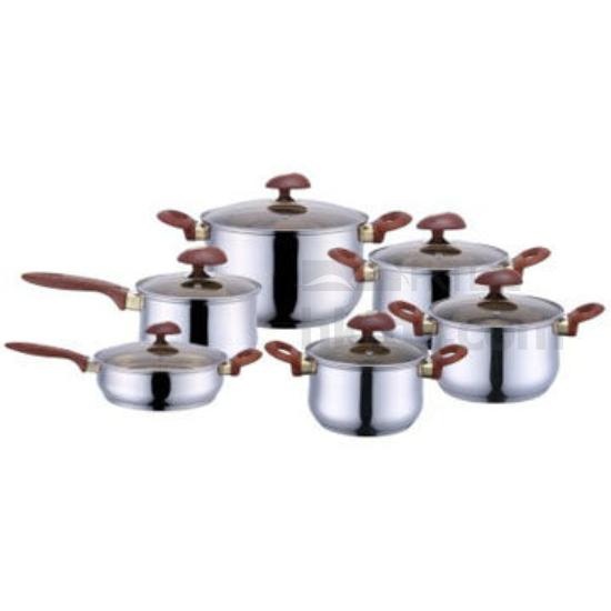 Stainless steel cookware set with saucepan, casserole and fry pan, heat-resistant bakelite handles, transparent glass lid for easy view while cooking, thick aluminum core in the bottom for good heat distribution
