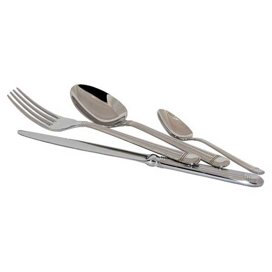 This set of stainless steel cutlery includes a knife, a fork and two spoons. The set displays its elegance with the a lustrous finish. The clean and neat design makes them presentable items on the dining table.