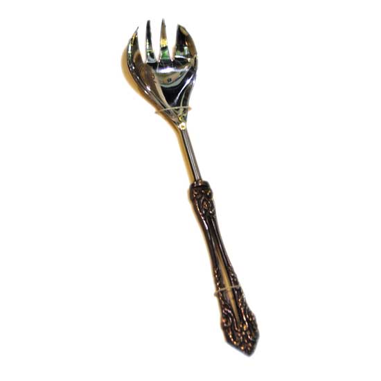 The stainless steel fork boasts a spoon shape contour for easy scooping. It comes with a delicately carved grip for elegant appeal. Add class to your tableware with this polished stainless steel fork.