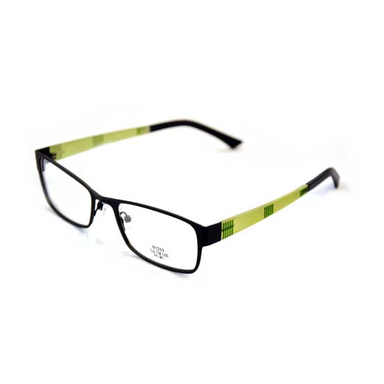 This men’s full-rim glasses frame comes with a dark-toned front and light green temples with vertical stripes. The transparent nose pads allow wearers to adjust gratifying fits. This fashionable full-rim glasses frame is made of stainless steel.