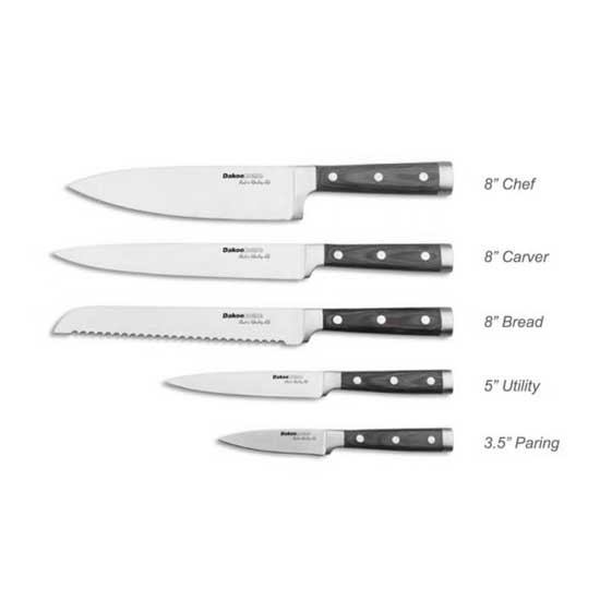 This deluxe kitchen knife set includes an 8" chef's knife, an 8" bread knife, an 8" carver knife, a 5" utility knife and a 3.5" paring knife. The stainless steel blades are waterproof and tarnish resistant. The ergonomic wooden handle guarantees a secure and comfortable grip.