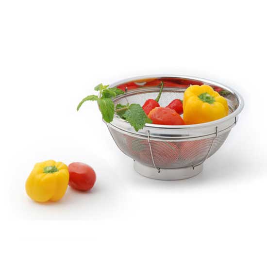 This round kitchen strainer features a basket-like design. It is constructed from stainless steel for long lasting performance. This basket strainer is a practical choice for every household.