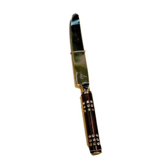 The stainless steel knife features a round barrel grip decorated with shimmering stones. It boasts superior durability and temperature resistance. The stainless steel knife is great for everyday use and special occasions.