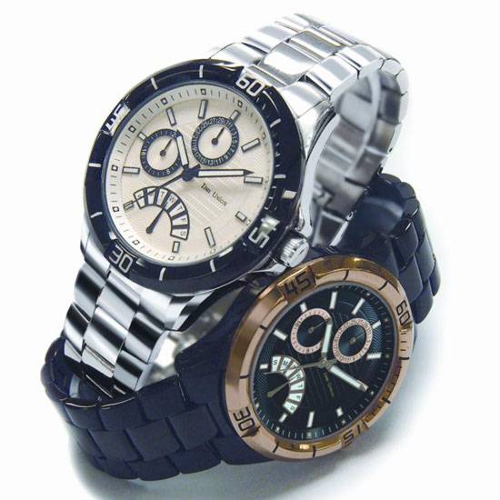This multi-function watch features a stainless steel case and wrist band for a shiny modern accent. It comes with a contrasting round bezel to create an individual, characteristic appeal. The rectangular-marker timepiece is equipped with
