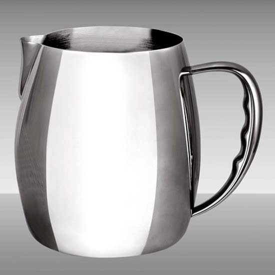 The luxurious stainless steel pitcher features a mirror finish and an ergonomic handle. The tapered spout allows for non-spill pouring of drinks. This high-quality stainless steel pitcher is suitable for iced and hot beverages.
