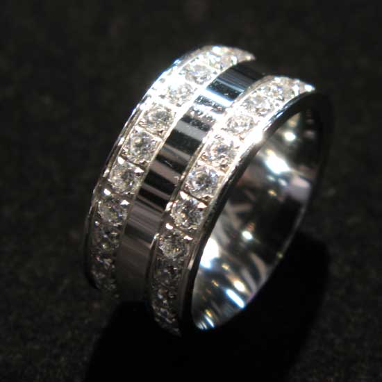 This attractive stainless steel ring features a band that is nicely polished to give out a shiny silvery surface. Both edges are embedded with cubic zirconia stones. This beautiful ring offers superior radiance in all rotations.