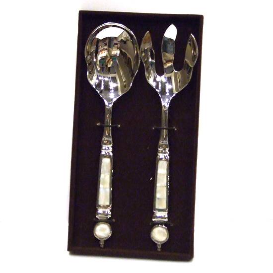This is a set of fork and spoon for serving salad. They are made of stainless steel and the handles are covered with mother of pearl (MOP). This salad serving set comes with mirror finish and is of modern style.