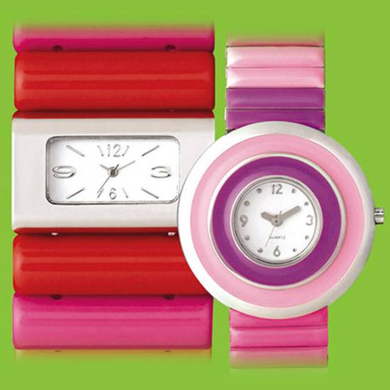 This fun watch features a colorful striped bezel and straps to create a modern, interesting appeal. The silver-tone Arabic pyramid numerals and dash indexes stylishly contrast with the simple white dial. This is the ideal timepiece for you to mix with your casual outfits and make an edgy fashion statement.