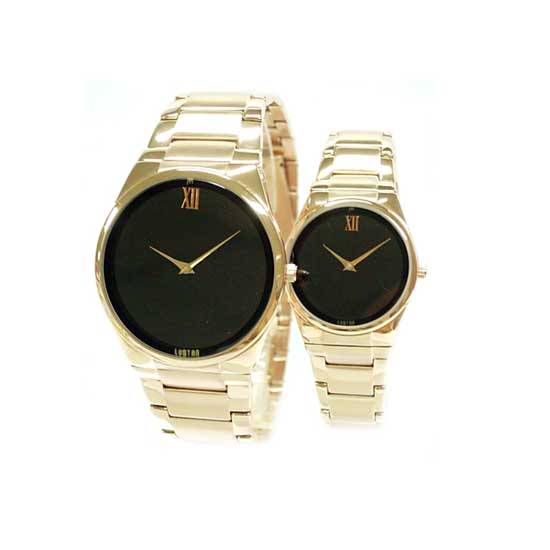 This eye-catching pair watch features a black dial with a golden bezel and a link-style watchband. The dial is minimally decorated with a Roman numeral marker at the 12 o'clock position. Designs in other colors and sizes are also available.