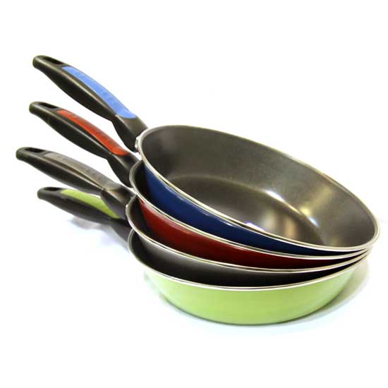 Showcased here are woks that can be used to make different dishes. They can be used to fry and deep-fry food. With non-stick coatings, the woks are easy to clean. They come with long handles for easy holding.
