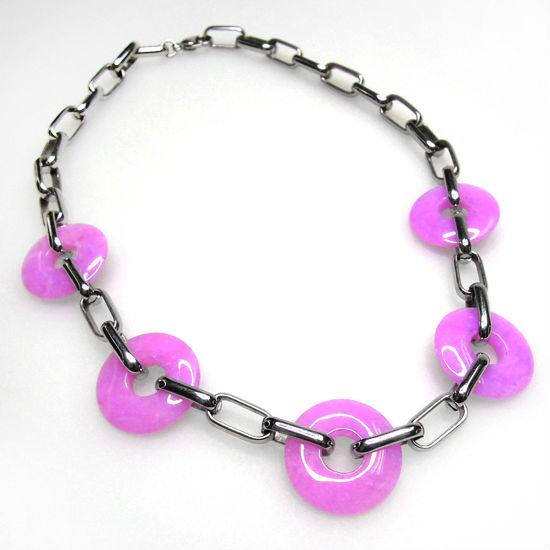 Five purple colored, disk-shaped jasper stone with center cut-out details.