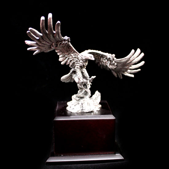 Highlighted is a sculpture featuring a standing eagle. Brilliant craftsmanship is exhibited in the delicate details and lively appearance. This vigorous eagle makes an impressive home or office decoration.