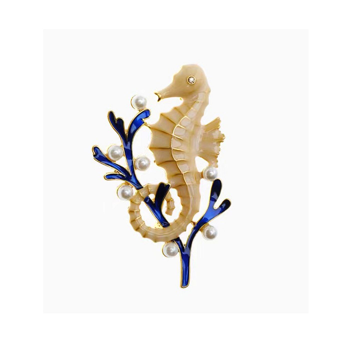 As shown is a high-fashion seahorse style imitation pearl golden plated alloy parts brooch.