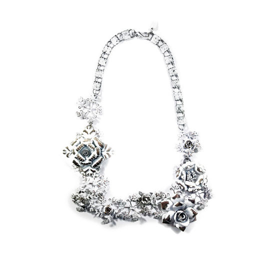 This statement necklace features multiple metal floral pendants decorated with a white-colored coating. It flaunts a stylish touch with its oversized, exaggerated design. This statement necklace pairs well with a turtle-neck, slim-fitting dress and a pair of ankle booties for a chic and trendy look.