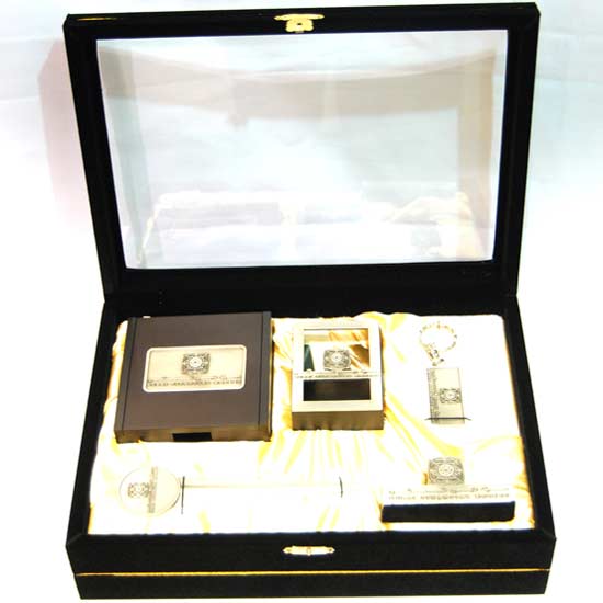 The stationery gift set comes with 5 pieces. They include a memo holder, a key ring, a card holder, a letter opener and a stationery holder. This set comes with box packaging for gift presentations.