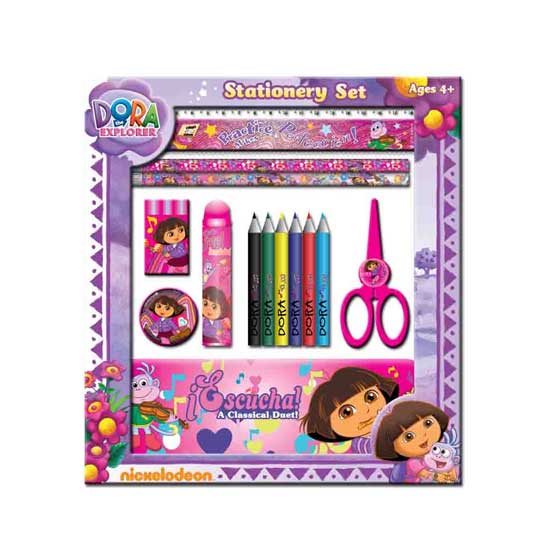 The displayed stationery set consists of a pencil case, pencils, a ruler, an eraser, a sharpener, color pencils, crayons, scissors and a bottle of glue. It is highlighted with patterns of various cartoon characters for extra appeal. This versatile stationery set is a great gift for your little one.
