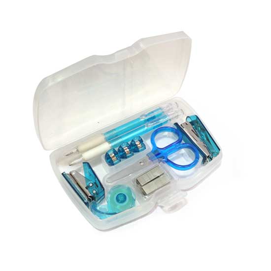 This high quality stationery set contains pens, staples, staplers, a pair of scissors and so on. The items are placed in a translucent box for easy carrying. This stationery set is a practical addition to homes and offices.