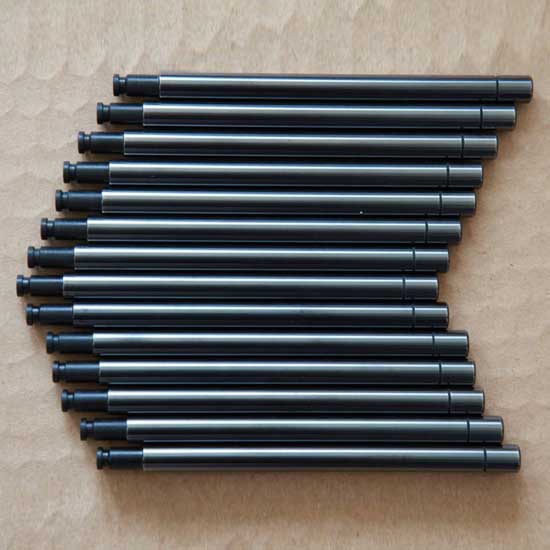Showcased is a steel rod featuring an extendable structure. The unique design is suitable for the gas-spring of automobiles. The surface is plated in metallic black with a burnished touch.