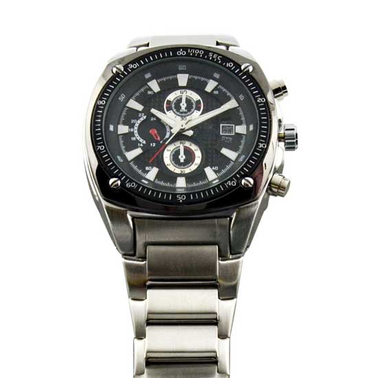 This men's wrist watch features brushed steel construction. The contrasting black dial is designed with raised indexes, three sub-dials and a date display window. The functional and reliable watch is ideal for everyday wearing.