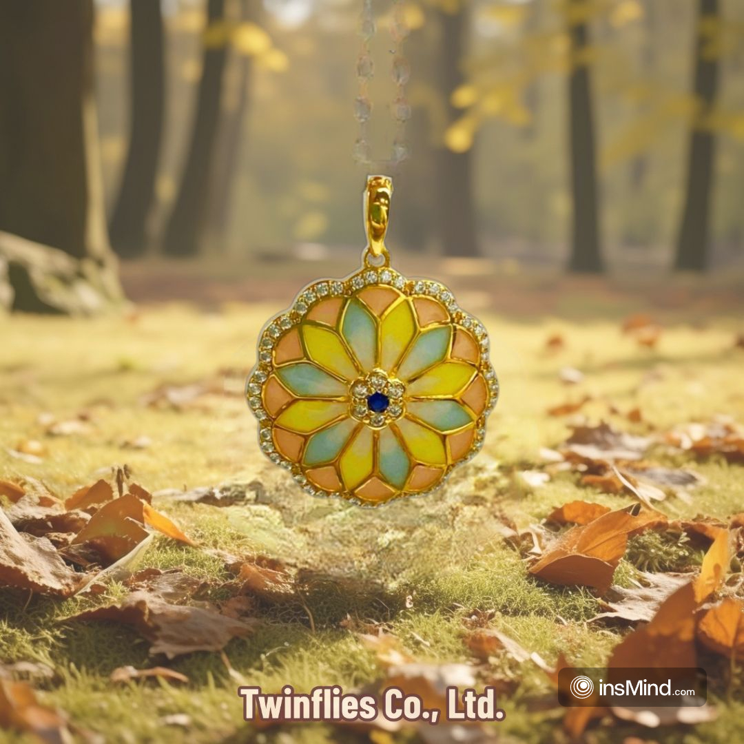 This stunning pendant from Twinflies Co., Ltd. showcases a floral design with a vibrant palette. The centerpiece is a flower with petals in shades of yellow and green, bordered by a ring of sparkling diamonds that add a touch of elegance. At the heart of the flower is a striking blue gemstone, which serves as a focal point and adds depth to the design. The pendant is crafted in a gold-tone metal, enhancing its luxurious appeal. This piece is perfect for those who appreciate nature-inspired jewelry with a pop of color and a hint of sophistication. It's a beautiful accessory that can complement both casual and formal attire.