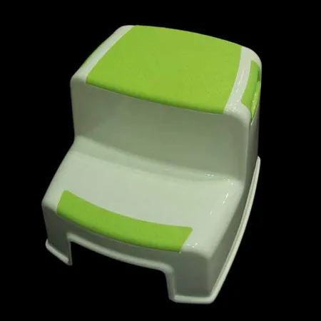 This step stool features a light green and white exterior with a non-slip surface. Two sides are skillfully crafted with cut-out handles for easy carrying and moving. The solid structure is sturdy enough for stepping.