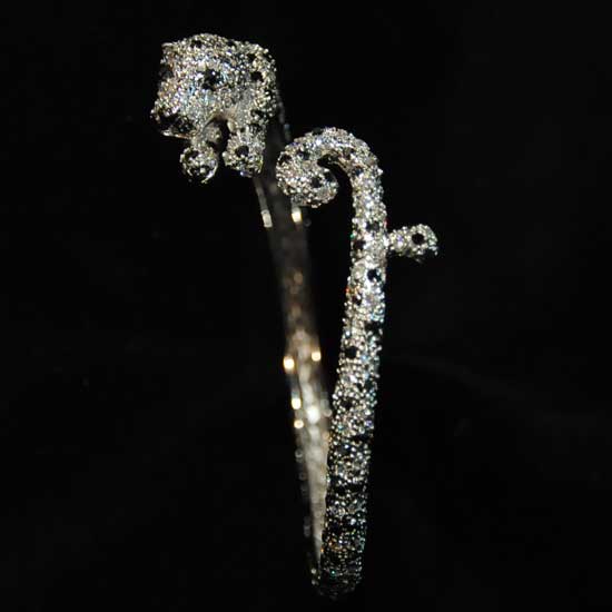 This pictured bangle showcases a leopard design well interpreted with delicate attention. The bangle is finely built with 925 sterling silver and CZ stones. Line your wrist with a charming wild touch with this florid bangle on.