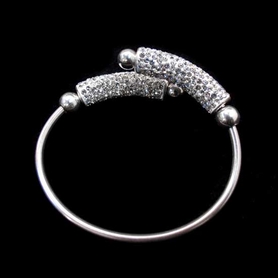 This bangle features a sterling silver structure with an adjustable size design. It is meticulously paved with really sparkling crystal elements on both bends for a unique touch. This shimmering bangle is easy to mix and match with any outfit.