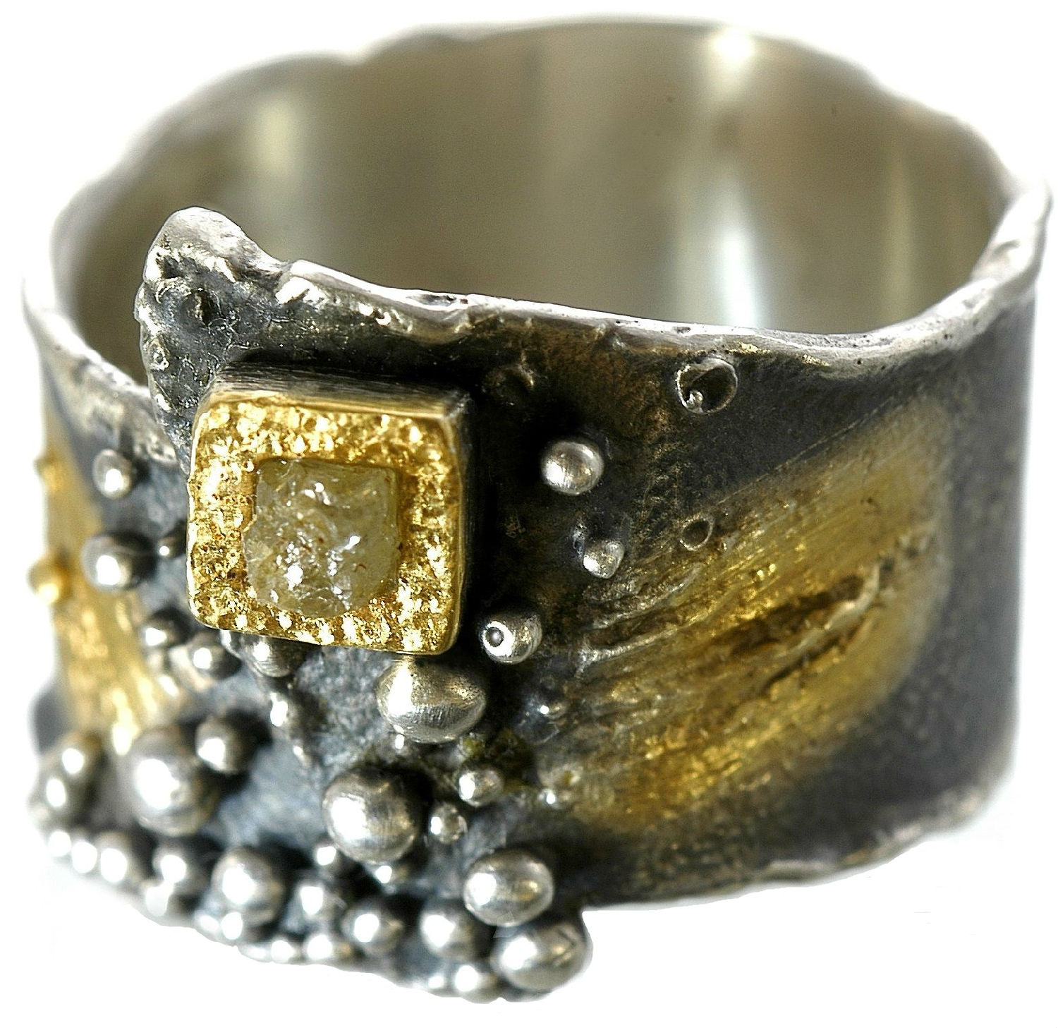 Sterling silver, gold-plated, oxidised ring with granulation and rough diamond