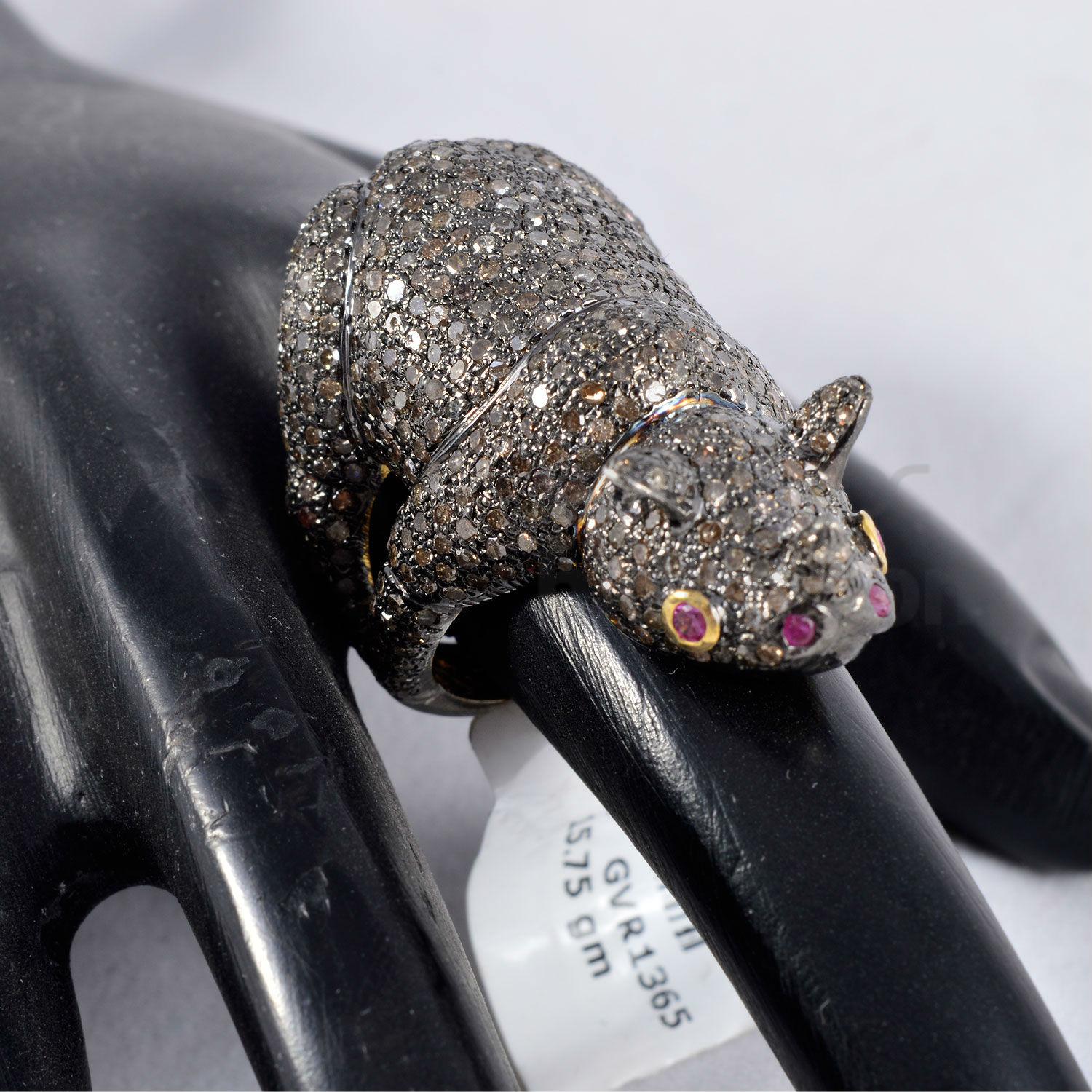 • This is animal design rhino ring studded with single cut diamonds in pave setting in sterling silver with oxidiesd victorian look. A lot of design are available for order and purchase for your collection