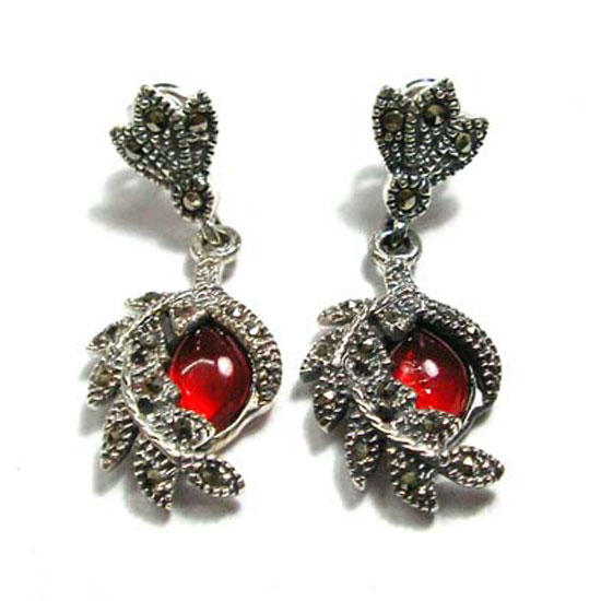 The sterling silver earrings are hung with two stunning decorations. The decorations are intricately crafted with leaves for enhanced glamor. The earrings are also characterized by their red ornaments with a distinct shine.