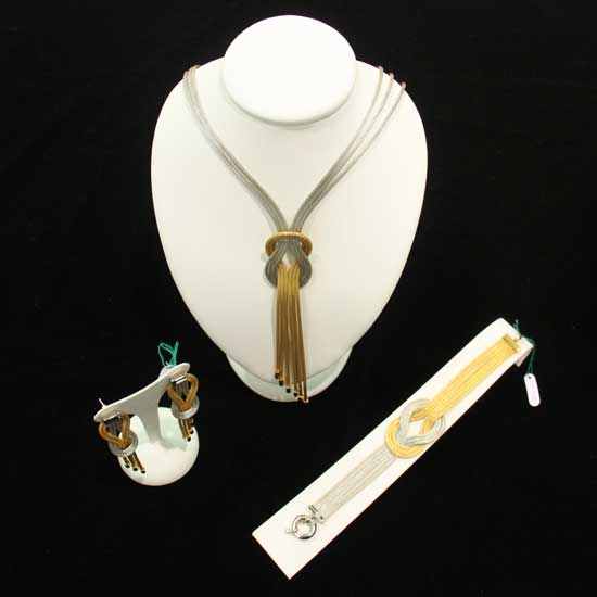 The stunning jewelry set is completed with a necklace, a bracelet, and a pair of earrings with a matching design. The top-grade sterling silver settings are meticulously plated with rhodium and gold, bringing out perfect radiance with irresistible brilliance. This beautiful sterling silver jewelry set makes an easy match with fashion outfits.